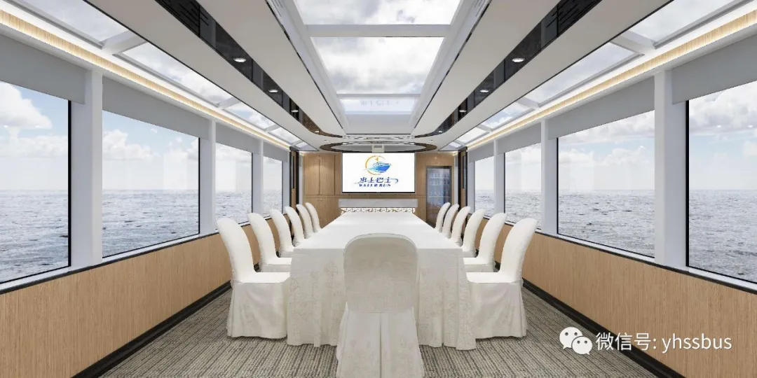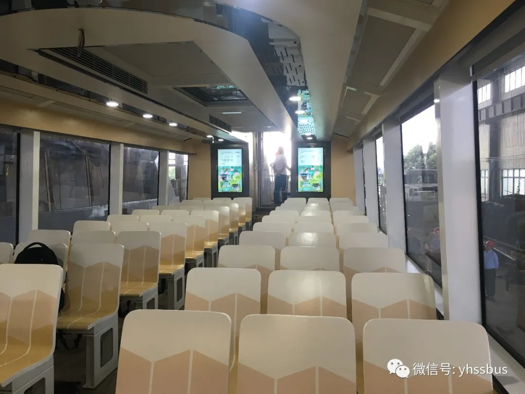 船艙內(nèi)部裝修風(fēng)格較傳統(tǒng)模式有了大突破,體現(xiàn)智能化、自動(dòng)化。室內(nèi)整體裝修采用的是現(xiàn)代流線型風(fēng)格,木紋色壁板,白色天花與周邊的黑色裝飾面板相得益彰,完美的體現(xiàn)了現(xiàn)代簡約風(fēng)格,室內(nèi)圓型天花吊頂、巴士椅上的油漆等線條元素參考自水流的波浪造型,生動(dòng)的再現(xiàn)了船舶室內(nèi)空間和室外水上空間的延伸與結(jié)合。內(nèi)部設(shè)置有全遙控電動(dòng)窗簾、全鋁合金裝修結(jié)構(gòu)、全微縫蜂窩板、帶小桌板座椅、可拆卸座椅、配備雅馬哈音響、65寸三星隱藏折疊式天花電視,亦可開會、接待。
